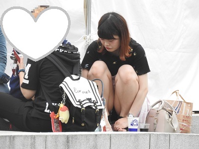 何かを飲みながら石段に友達と一緒に座っている綺麗なお姉さんが、黒のパンティーを見せています。スタイルが良く脚が細いので、スカートの奥まで見えています!!