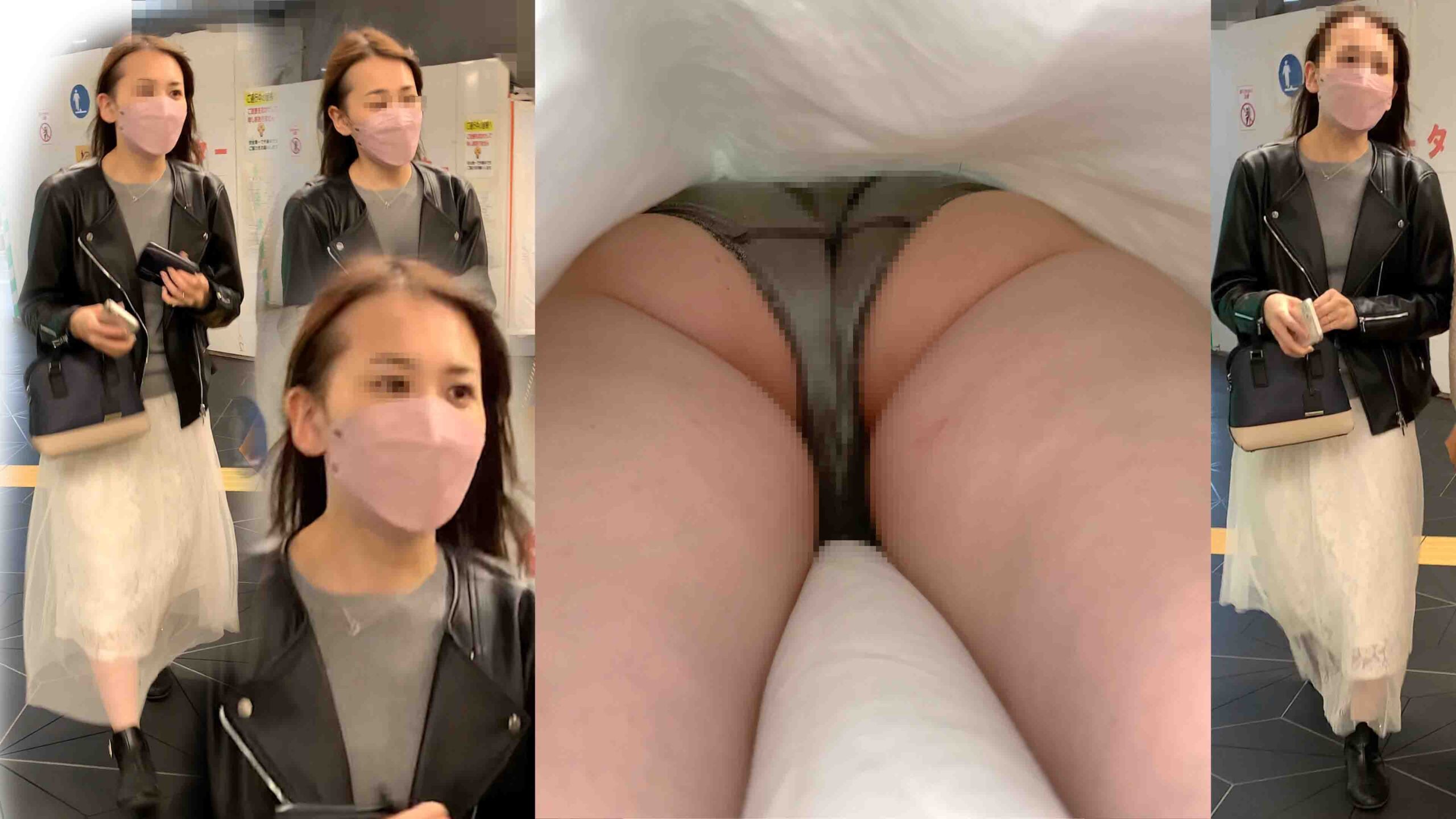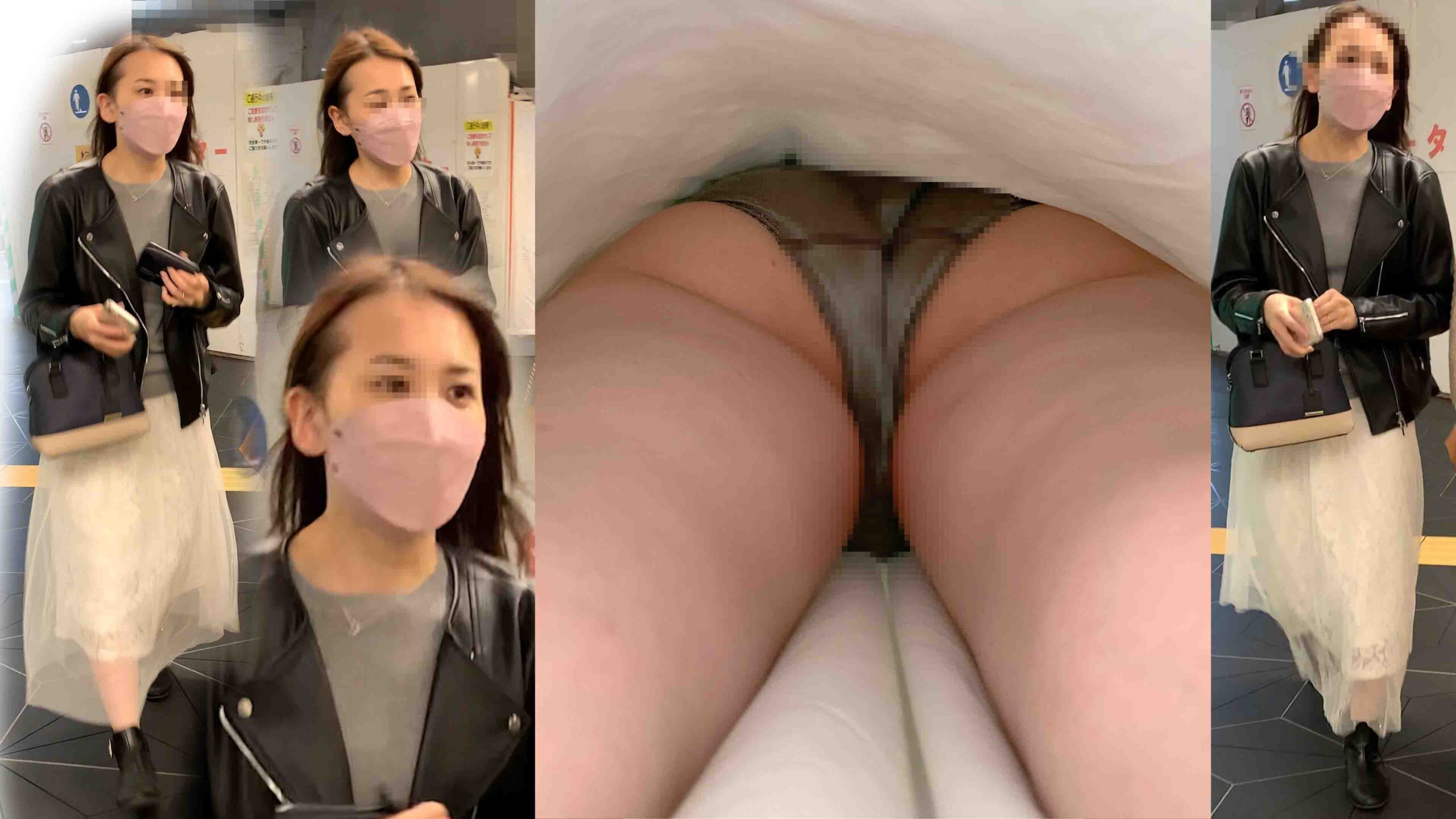 ライダースに白のフレアスカートに生足のOLお姉さん。